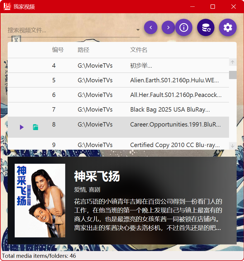 FileSystemWatcher)。 - 任何时候当您在外部环境中(比如通过迅雷或者浏览器)向已挂载的目录中下载、新增、删除或者重命名了影视文件,软件的后台神经系统都能在 1 秒钟内光速察觉,并立刻引发一次平滑的自动列表校准。界面的数字与条目将瞬间刷新出您刚倒腾好的新影片,真正做到无人值守!